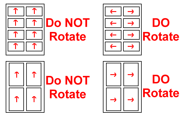 6. OPTIONAL This step needs only be done if the imposition for this size pages on the digital press sheet are positioned with the head of the calendar facing left or right. If the head is towards the top or bottom of the imposed page, it does not need to be rotated. See the image below to understand this. If needed use Acrobat's Rotate Pages tool to rotate all the pages in this document 180 degrees so they are upside down. You can tell by checking the width of the calendar to see if it will fit 2 across on a 12.5 inch wide sheet.