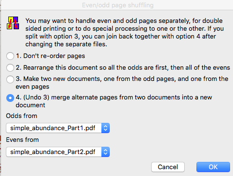 10. Then use Quite Imposing to Suffle Even/Odd Pages. Select option 4 (Undo). This mergest alternate pages from two documents into a new document. Select Odds from Part1 pdf and Evens from Part2. This makes another new pdf that contains all the pages from both PDFs. The odd pages will be from part1 and the even pages from part2.
